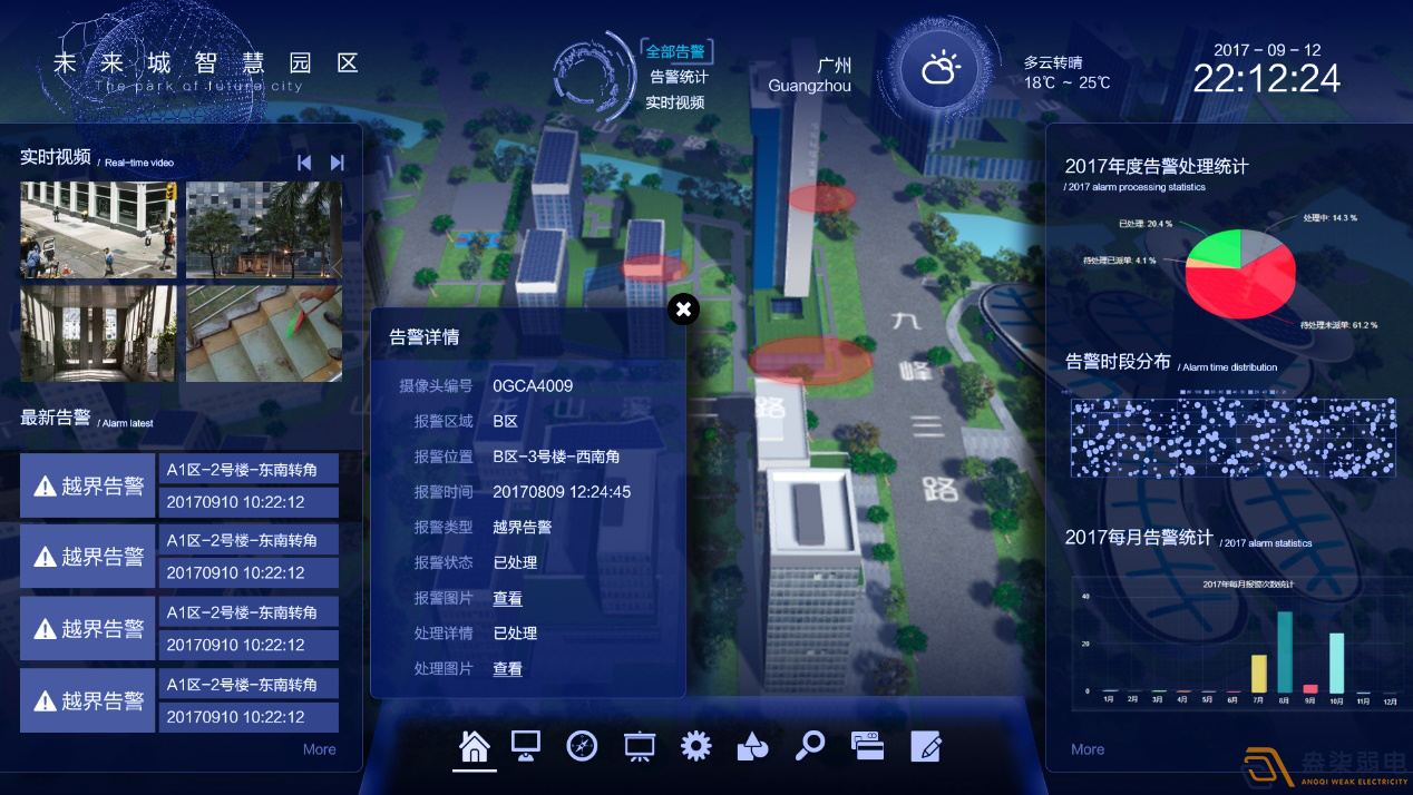 企業園區綜合安防管理系統,搭載了視頻監控子系統、智能一卡通子系統(含門禁系統、考勤管理、梯控、巡視、人員通道、交易、訪問者等)、地下停車場子系統、入侵報警子系統、動環監控子系統等,根據生產制造類企業園區里人、車、物業務需求給予綜合管理方法業務流程優化構思,達到生產制造類企業日常業務流程管理上對安防監控系統的業務需求及其提高了企業園區管理方法實效性,讓園區安全系數高、讓園區里的工作人員工作和生活更快捷、讓園區整體管理更加科學效率。